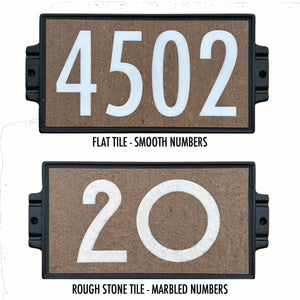 Elevate your home's aesthetic with our Light Chocolate Address Plaque. Glossy White Numbers stand out against the background of a light brown porcelain tile. Choose between the sleek simplicity of a Flat Tile with Smooth Numbers or the artisanal charm of a Rough Stone Tile featuring Marbled Textured Numbers. These signs offer outstanding visibility, even in low-light conditions, thanks to their unique reflective properties.